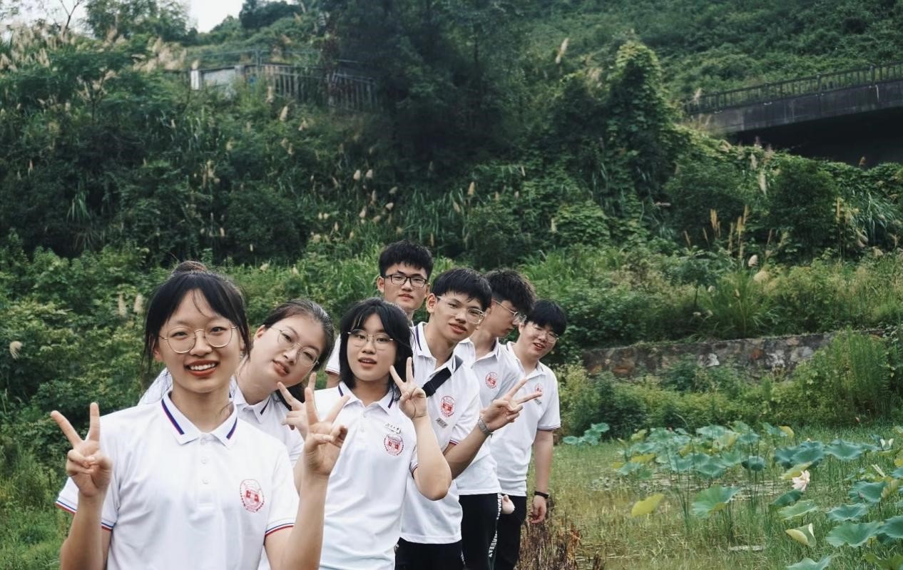 (同学们在荷花池旁留念)