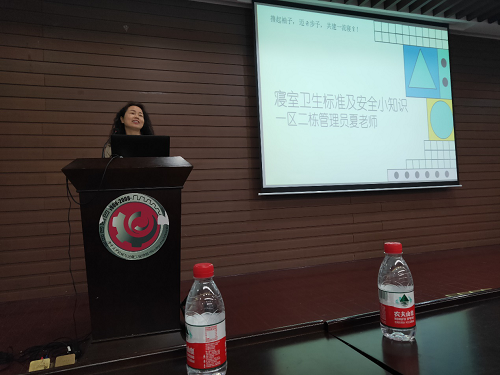 随后一区二栋管理员夏老师也上台为同学们讲解了文明寝室的相关标准,指出了天马1区2栋所存在的相关问题并回答了在场同学们的疑惑。夏老师在讲话中说到,希望出现更多的文明寝室和优胜寝室,创建更好的寝室氛围。
