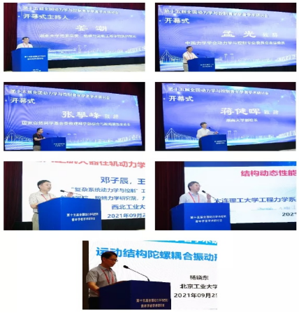 执行院长姜潮教授主持,中国力学学会动力学与控制专业委员会主任委员孟光教授,国家自然科学基金委数理科学部综合与战略规划处处长张攀峰教授,湖南大学副校长蒋健晖教授分别致开幕辞。中国力学学会副理事长郭旭教授、杨绍普教授出席了开幕式。西北工业大学邓子辰教授、大连理工大学郭旭教授、北京工业大学杨晓东教授等分别结合自身研究方向,为与会代表们做了精彩的大会特邀报告。