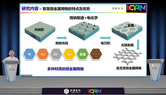 该获奖课题创新性地提出“多功能金属微网格柔性电极”的新思路,通过将微纳光刻和高精度电镀技术相结合制备了系列材质、形状、尺寸、透光率和厚度可精准控制的柔性超薄超轻金属网格,并将其成功应用在柔性电池和柔性电致变色器件中(相关工作请见//onlinelibrary.wiley.com/doi/10.1002/adfm.202106550;//onlinelibrary.wiley.com/doi/full/10.1002/adfm.202100290;//onlinelibrary.wiley.com/doi/10.1002/eem2.12303),为柔性电极的轻量化设计和柔性电子的多功能集成提供了一种新的方法和思路。
