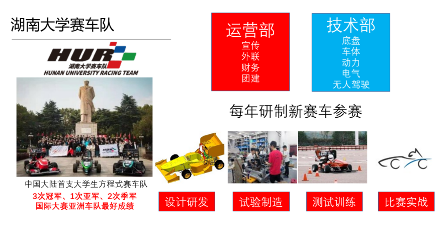 老师与同学们的努力奋斗,勤奋钻研之下,数年来积累了许许多多耀眼的成果。特别是欣欣向荣、反响热烈的湖南大学赛车队:作为中国大陆首只大学生方程式赛车队,具备运营部、技术部及下设职能组等相当完善的组织架构,斩获3次冠军、1次亚军、2次季军等耀眼成绩。这既展示了澳门银河娱乐城官网