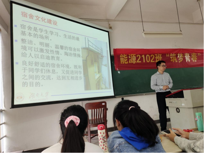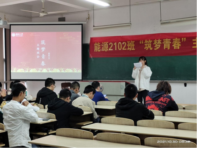 10月30日上午,能源2102班于综合楼302教室召开了“筑梦青春”主题班会。在该班会中,来自湖南大学图书馆的馆长段辉高老师莅临指导,班主任陈敬炜老师、班级助理张凯文同学也受邀参加了此次班会。