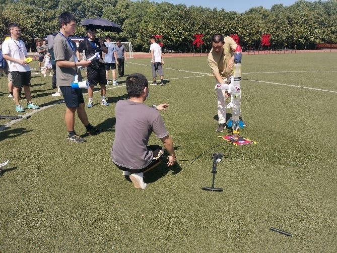 、湖南省宇航学会、湖南省航空运动协会联合承办,共设置两个竞赛项目:(1)多级模型火箭发射与载荷回收(2)模型水火箭助推航天器,旨在培养同学们自主创新、自主设计和自主实践的精神。本次参赛的同学只参加了模型水火箭助推航天器项目,有来自全省不同高校的40支队伍参加了此项目的比赛。