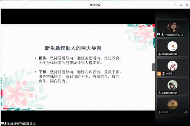 新生助理培训第二期课程顺利开展。本次培训的主题是心理健康教育,机械院2020级本科生辅导员李明泽老师、叶胜老师指导组织,辅导员闫智琪老师主讲,全体新生助理参与培训。