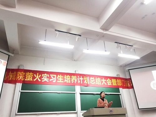 本次活动主要分为两个部分,第一部分是萤火实习生培养计划总结大会,这次大会是各小组筹备已久的,大会的主要目的是让实习生们对近期的学习成果进行总结和展示。大会伊始,孙文婷老师陈述了本次培训名称为“萤火计划”的原因是萤火虽小,却很闪亮,星星之火,亦可燎原。她表示,今天是培训计划的总结大会,好像已经结束,但我们的学生干部生涯才刚刚开始,大家应把这一天当作一个里程碑一样的仪式来牢记。不忘初心,牢记使命,我们应一直牢记当时入会的心情,作为学生会干部,我们必须要有热情,要坚持。希望大家能在团委学生会有所成长,有所收获,希望大家未来在机械院,在学校,在国家,在世界能够像萤火一样闪闪发光,并且越来越亮。