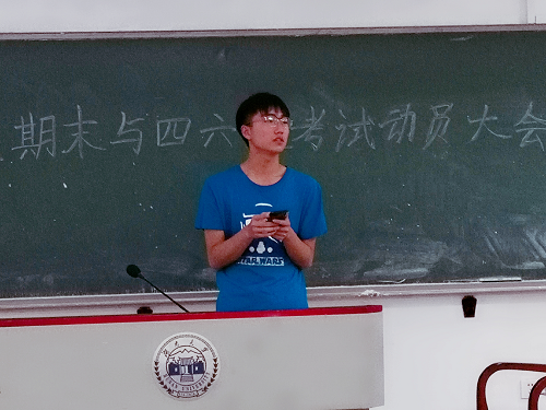 会上,班长兰天同学进行主持,他先对大家做了考前提醒,指出在四六级考试中,同学们需要记得带好的必要东西,如准考证,身份证,2b涂卡铅笔与碳素墨水笔等。除此之外,他还提醒同学们要提前二十分钟入场,抓紧时间写完作文以便留出五到十分钟来查阅听力部分的题,做听力部分的题时,要边做边涂卡以免考完收卷时出现没时间涂卡的情况。提及期末考试的注意事项时,他着重强调了需要带黑笔和校园卡,并准时参加考试。同学们听讲十分专注,并且做了记录。然后班长兰天委派班级里的几名同学下发了四六级准考证和四级成绩单。