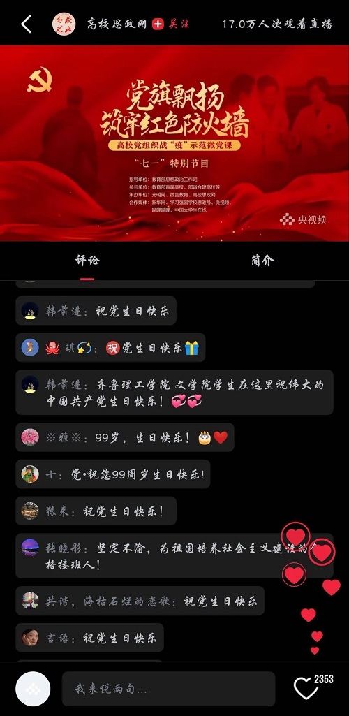 今天的直播中还有一句令人难忘的话:“心有所信,方能致远”。习近平主席一直以来都非常强调初心的重要性,中国共产党成立以来的这99年,我们经历了创立之初的筚路蓝缕,解放战争的军民同心,建国之初的艰难探索和改革开放的大展宏图,我们之所以在任何环境中都能勇往直前,就是因为我们心中始终与人民在一起,把人民的利益和祖国的复兴作为己任。如今我们正朝着实现中华民族伟大复兴的道路前进,我们这些后浪也一定要将初心守护好。
