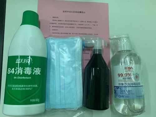 每个返校礼包中包含10个医用防护口罩,1瓶消毒液、1个消毒喷瓶、一瓶免洗消毒凝胶,还有澳门银河 给返校学生的防疫温馨提示。在发放过程中,辅导员叮嘱返校同学勤洗手、勤通风、戴口罩、少聚集、少外出、注意饮食习惯、加强身体锻炼,以最好的状态完成返校期间的学习科研工作。